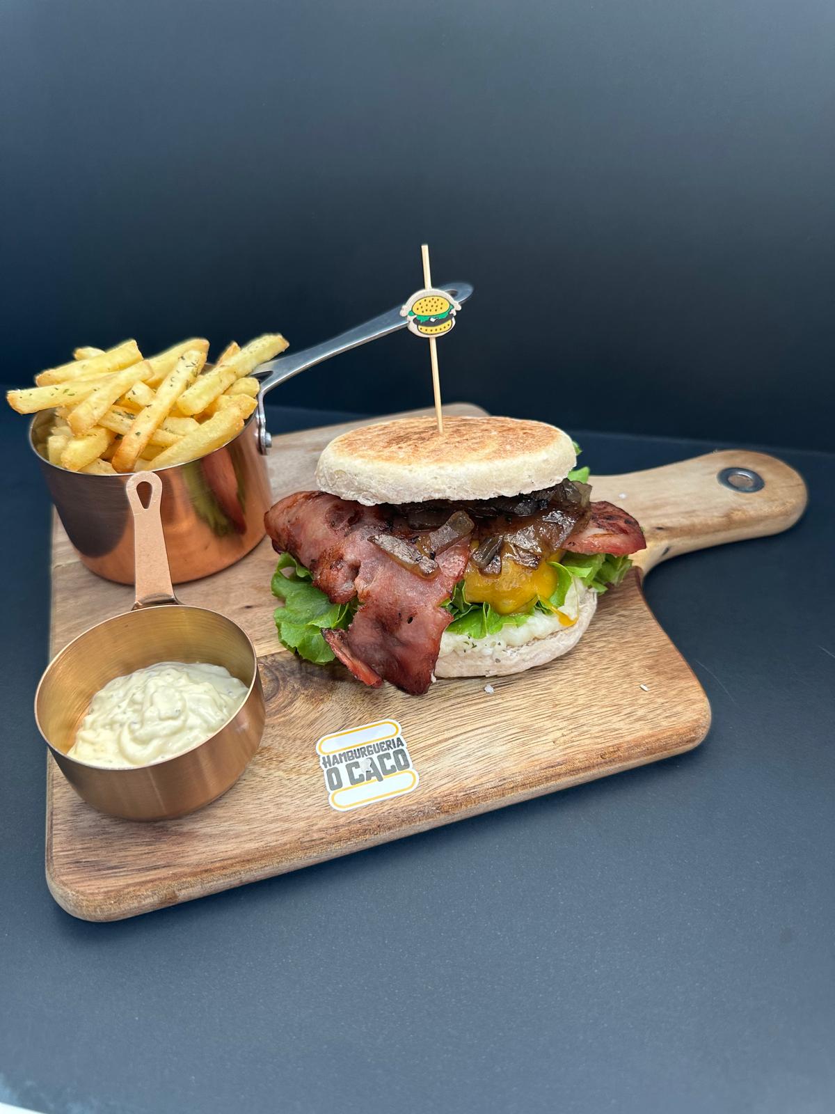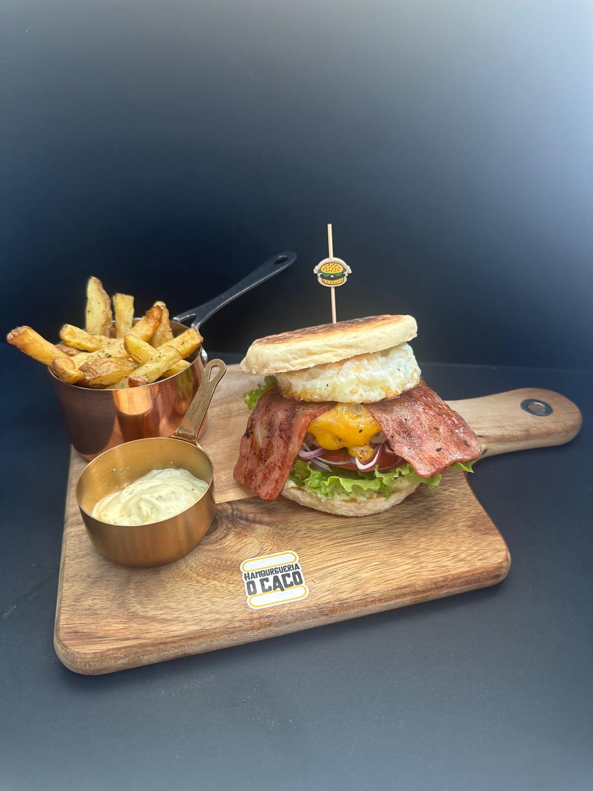 Bacon, ovo, queijo cheddar, alface, tomate, cebola roxa e molho da casa.