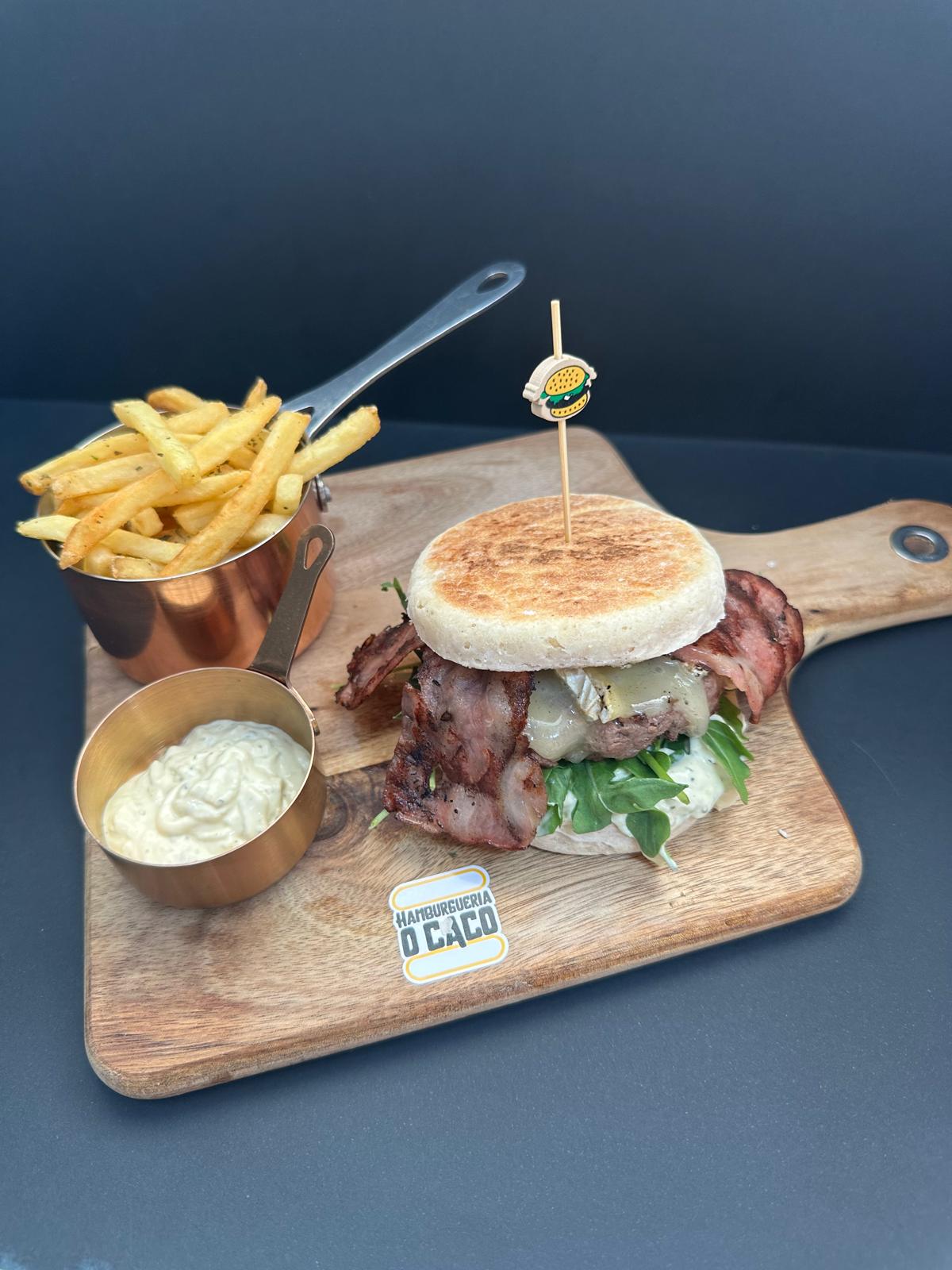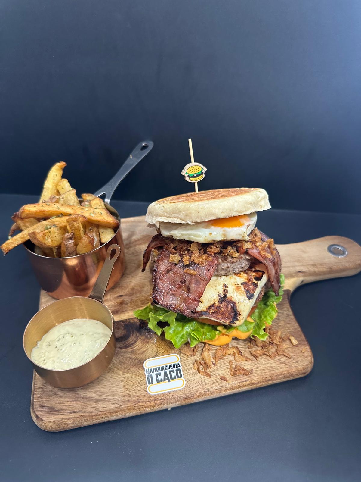 2 carnes, bacon, queijo grelhado, ovo, cebola crispy, alface, tomate e molho cheddar.