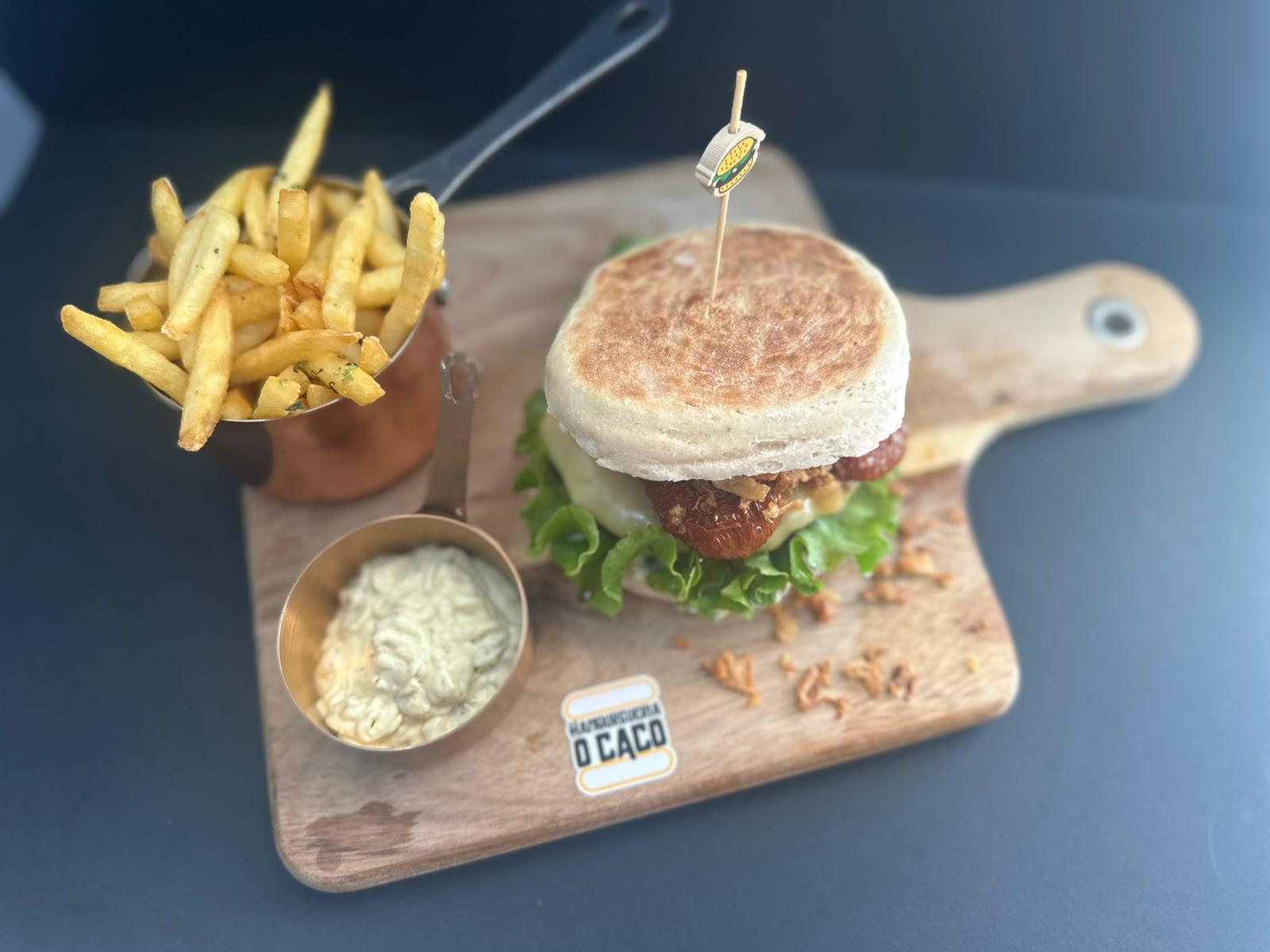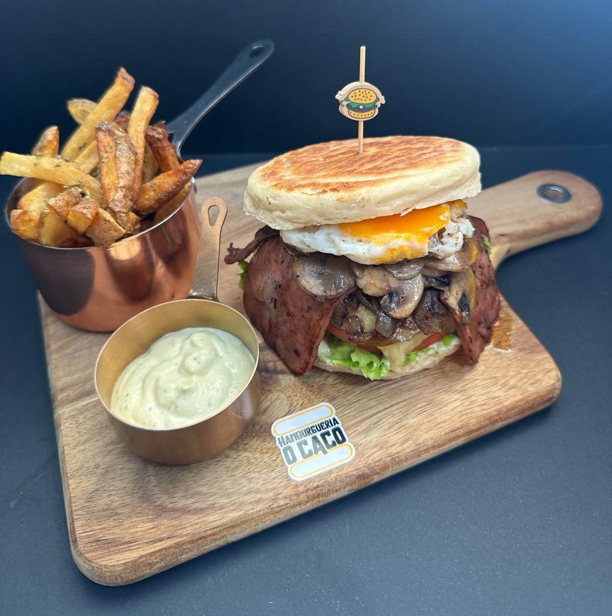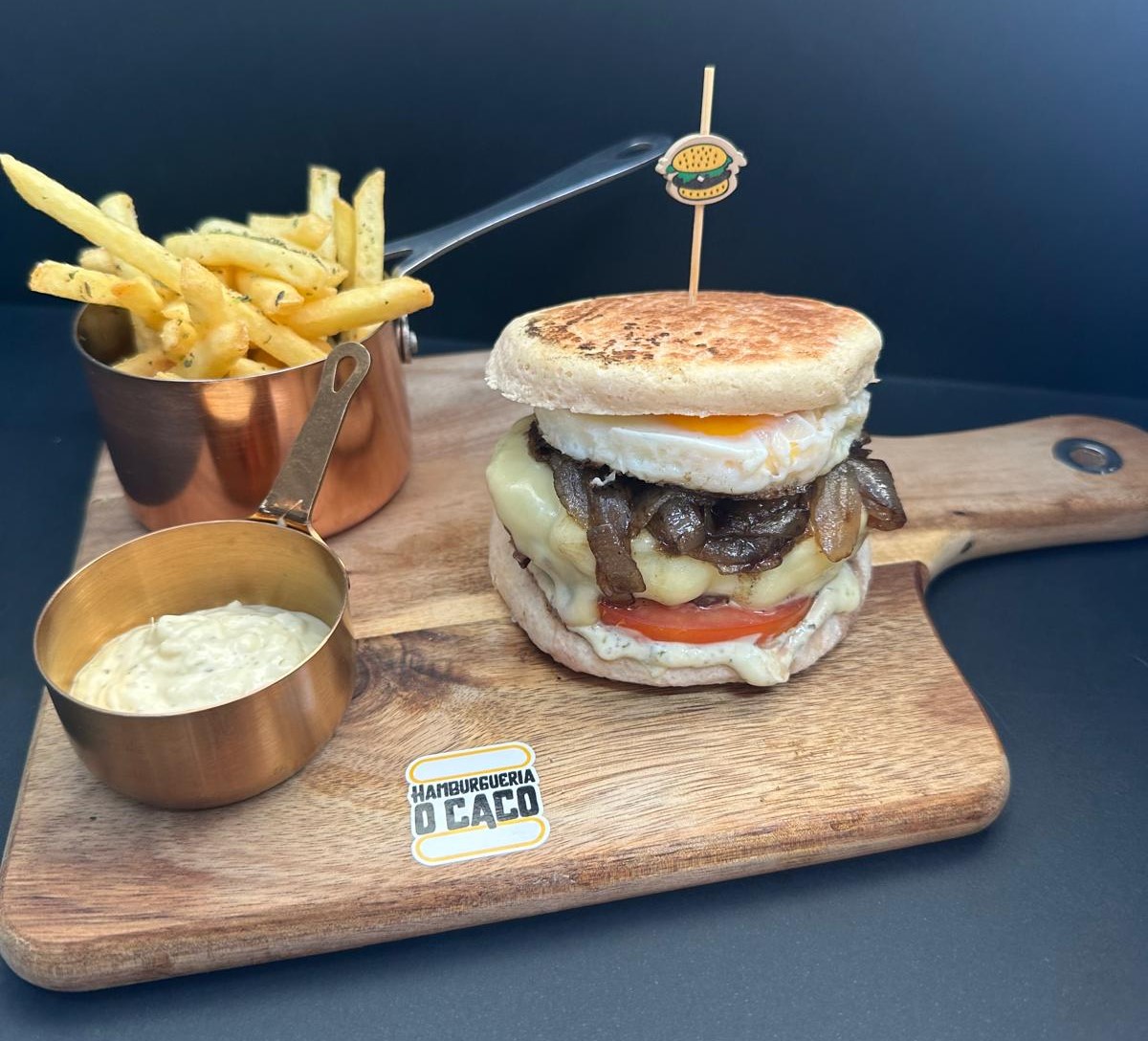 Bacon, cebola caramelizada, cogumelos, queijo flamengo, ovo, alface, tomate e maionese de alho.
